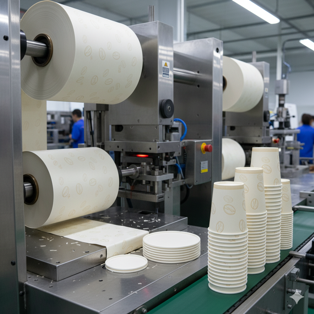 La production débute par la découpe à l’emporte-pièce: on obtient des “blanks” en forme de secteur de couronne, dont le rayon et l’angle déterminent le volume final (4 oz à 20 oz et plus). En parallèle, des disques sont découpés pour le fond; leurs diamètres excèdent légèrement le diamètre intérieur pour permettre un sertissage étanche. Les chutes de carton sont généralement collectées et réintroduites dans le circuit de recyclage interne.